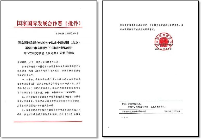 近日,公司的“对外援助项目咨询服务单位资格”顺利通过国家国际发展合作署的再审核认定。